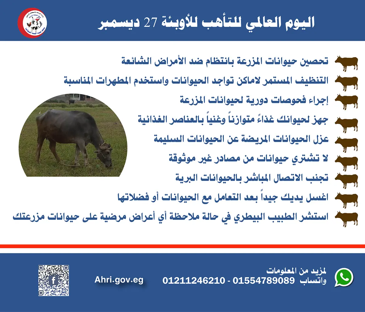 يسلط اليوم العالمي للتأهب للأوبئة، الذي يتم الاحتفال به في 27 ديسمبر، الضوء على الحاجة الملحة للاستثمار في الأنظمة القادرة على منع تفشي الأمراض المعدية واكتشافها والاستجابة لها. وفي هذا السياق، يُنصح مربو الماشية بضرورة الالتزام بتحصين حيوانات المزرعة في مواعيدها المحددة للوقاية من الأمراض، والاهتمام بتطبيق معايير الأمن الحيوي داخل المزرعة لتقليل مخاطر انتقال العدوى. كما يُوصى بتوفير تغذية متوازنة وغنية بالعناصر الضرورية لرفع مناعة الحيوانات، مما يسهم في الحفاظ على صحتها وزيادة إنتاجيتها.